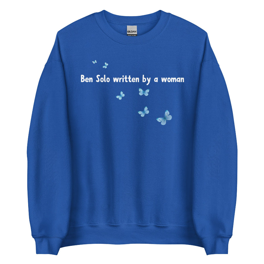 Ben Solo Written by a Woman’ unisex sweatshirt with printed blue butterfly design, Reylo and Star Wars feminist inspired fan merch referencing Adam Driver and Rey, cozy cotton polyester blend, inclusive sizing XS–4XL, Save The Hunt for Ben Solo fans, billboard and meet-up gift.