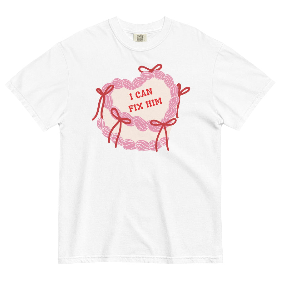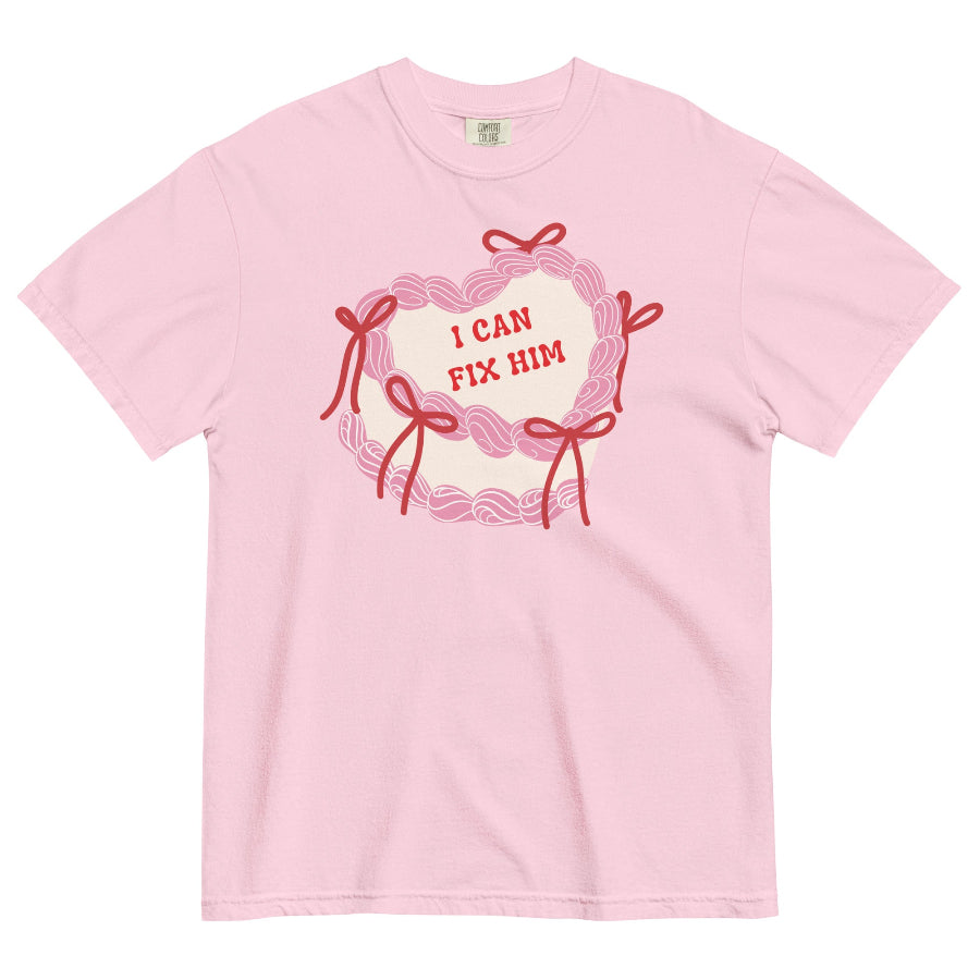 This coquette-inspired Valentine tee features a girly birthday cake design paired with that iconic line: “I can fix him.” Sweet on the surface, absolutely feral underneath — perfect for fans of hot villains, morally gray men, romantasy crushes, and unapologetic delusion.