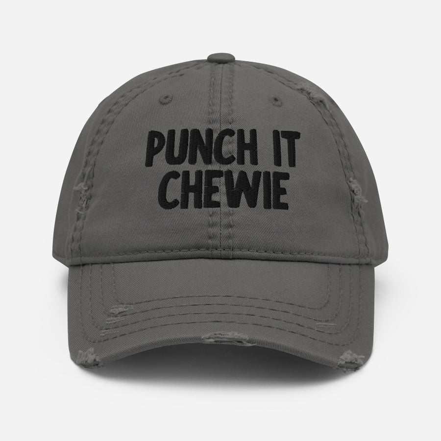 Distressed dark grey dad hat with embroidered “Punch It Chewie” text inspired by Star Wars